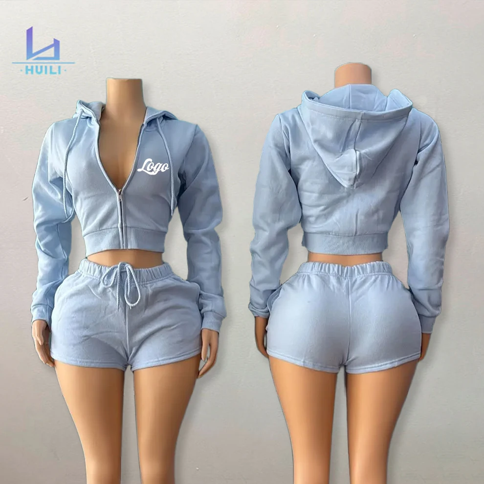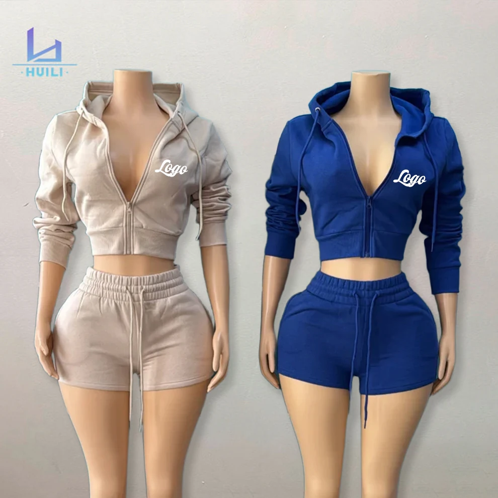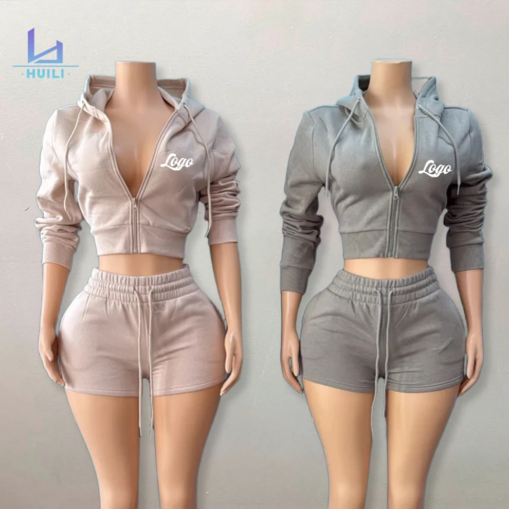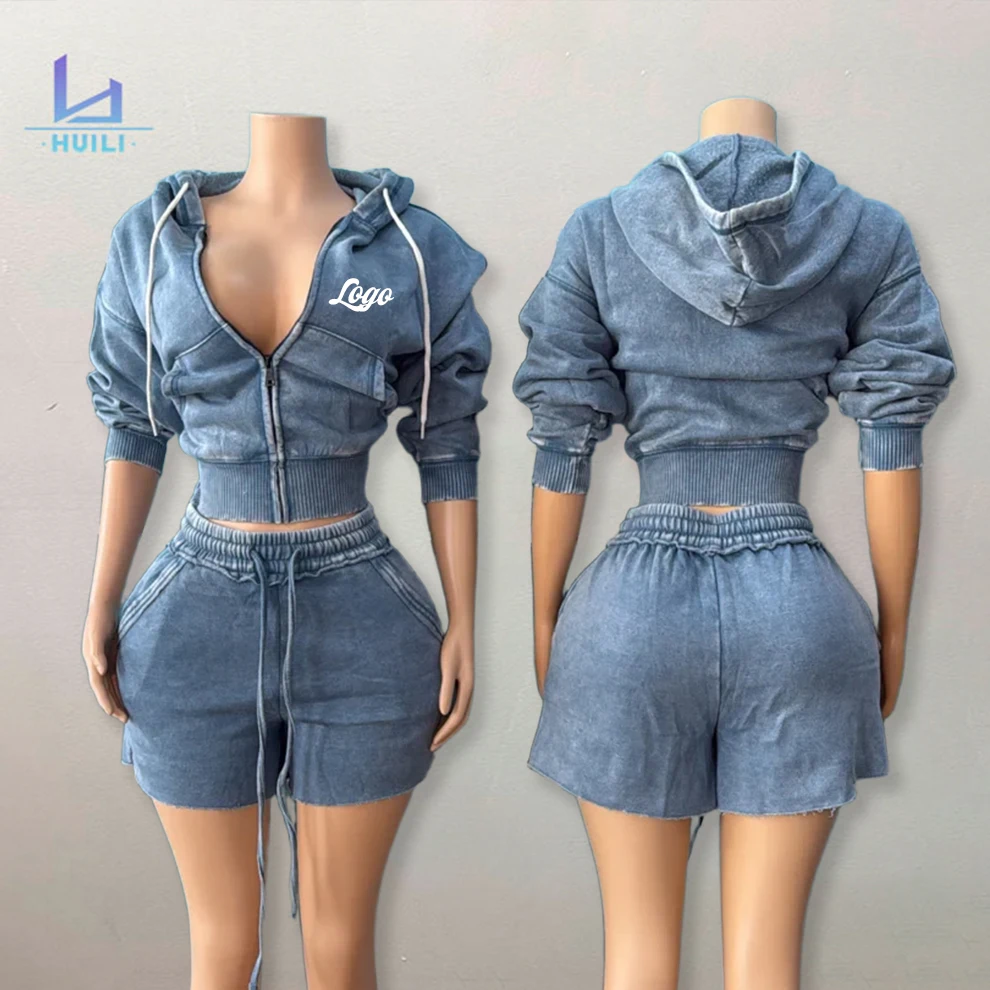 Huili French Terry Vintage Wash Soft Zip up Hooded Jacket Raw Hem Shorts Custom Two Piece Blank Hoodies and Shorts Set for Women